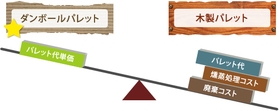 ダンボールパレット(TSパレット202の場合)は一般的な木製パレットよりも安い単価となっています。ダンボールパレットは木製パレットに必要な燻蒸処理が不要で、リサイクルできるのでトータルコストがグッと抑えられます。さらに、軽量なためトラックの積載量も抑えられ、その分輸送エネルギーを抑えることができます。物流コスト削減をお考えの企業様には、ダンボールパレットが最適です。