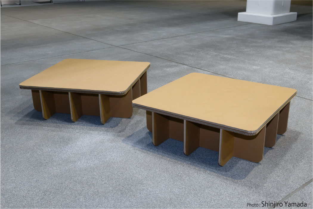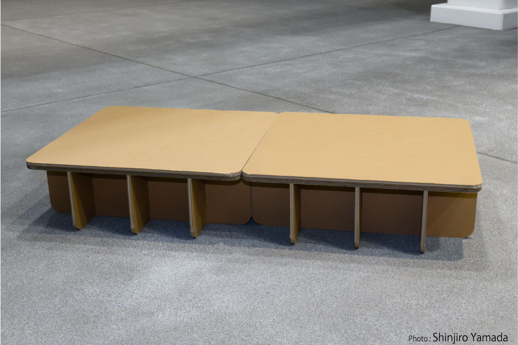 • 強化ダンボールベッドだけでなくテーブルとスツールも中に置けるので室内で就寝するだけでなく、食事や仕事をすることもできます。