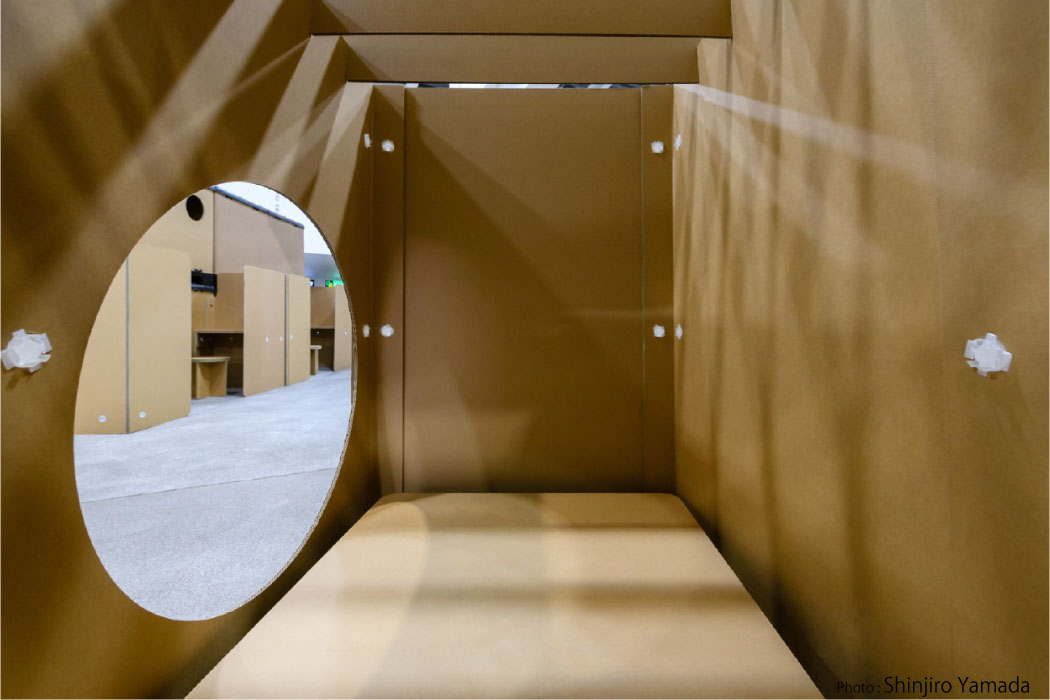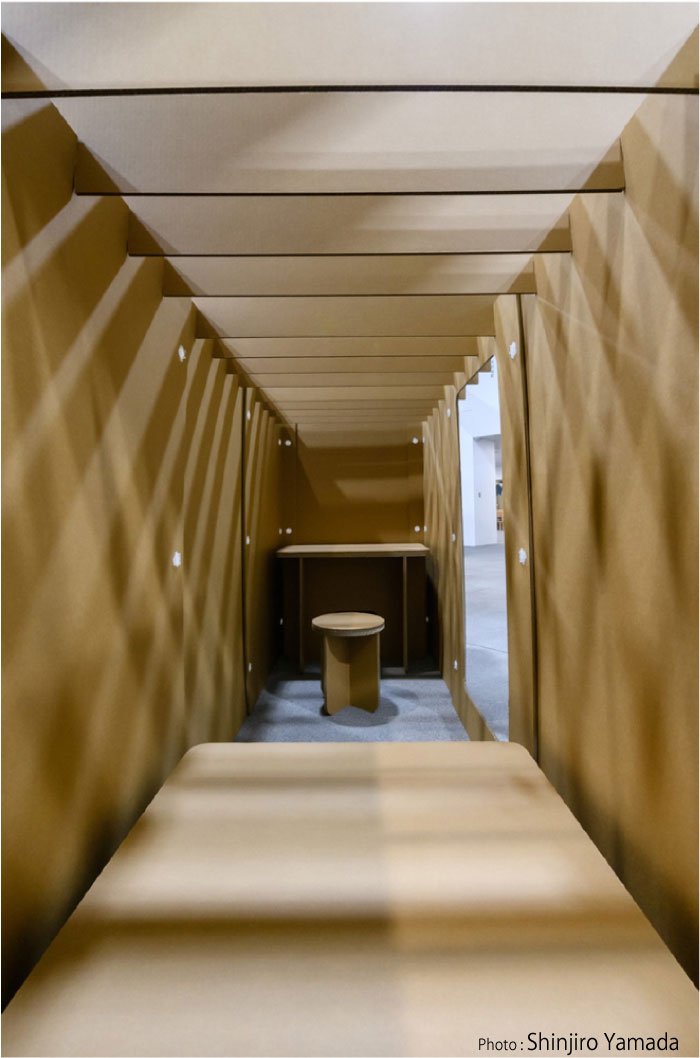 • 10mm厚の強化ダンボールを使用し強く十分な剛性があり、数カ月の滞在にも十分耐えうる耐久性があります。